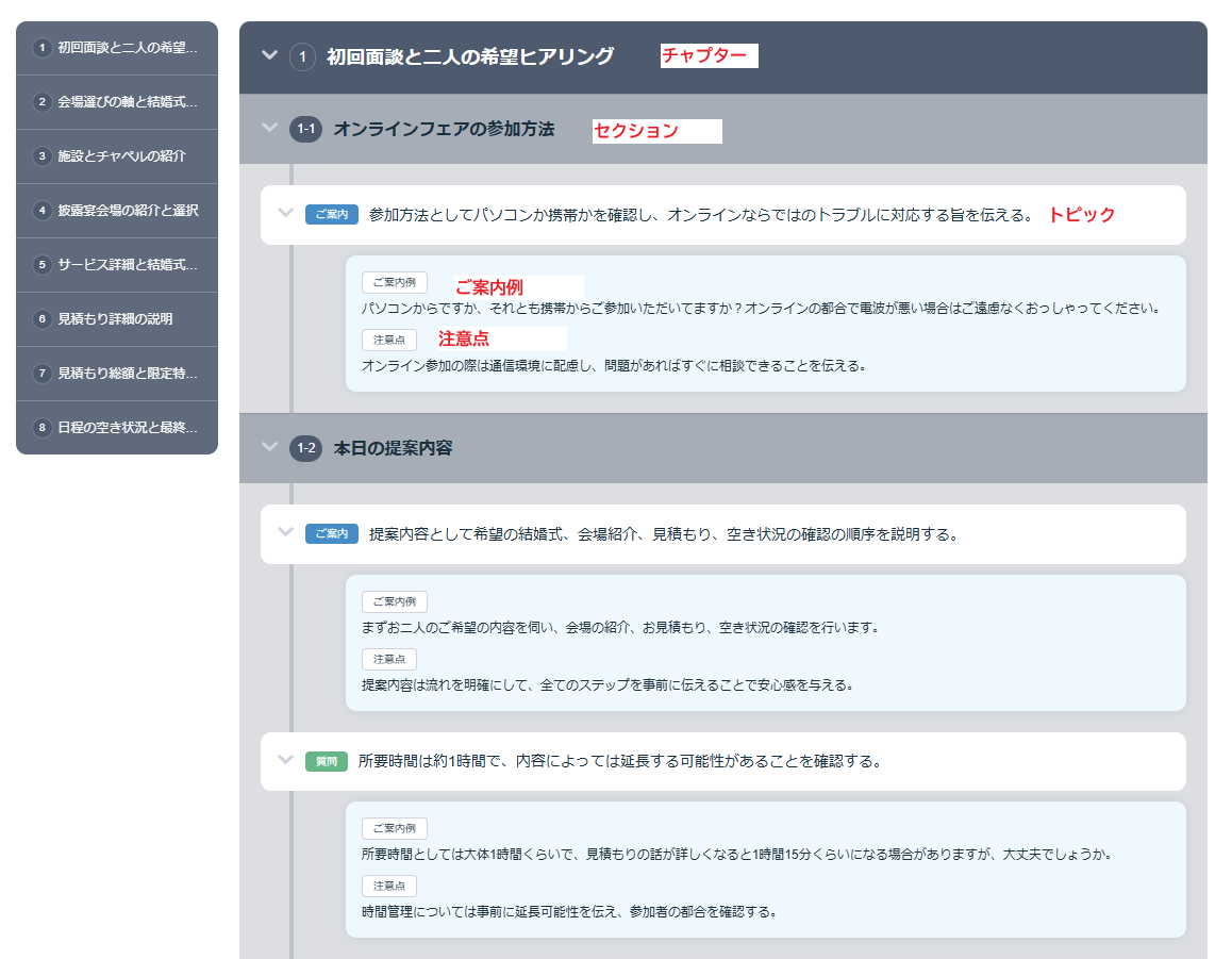 シナリオはチャプター/セクション/トピックの3種類のブロックによって構成され、トピックには「ご案内例」「注意点」の情報が付随します。