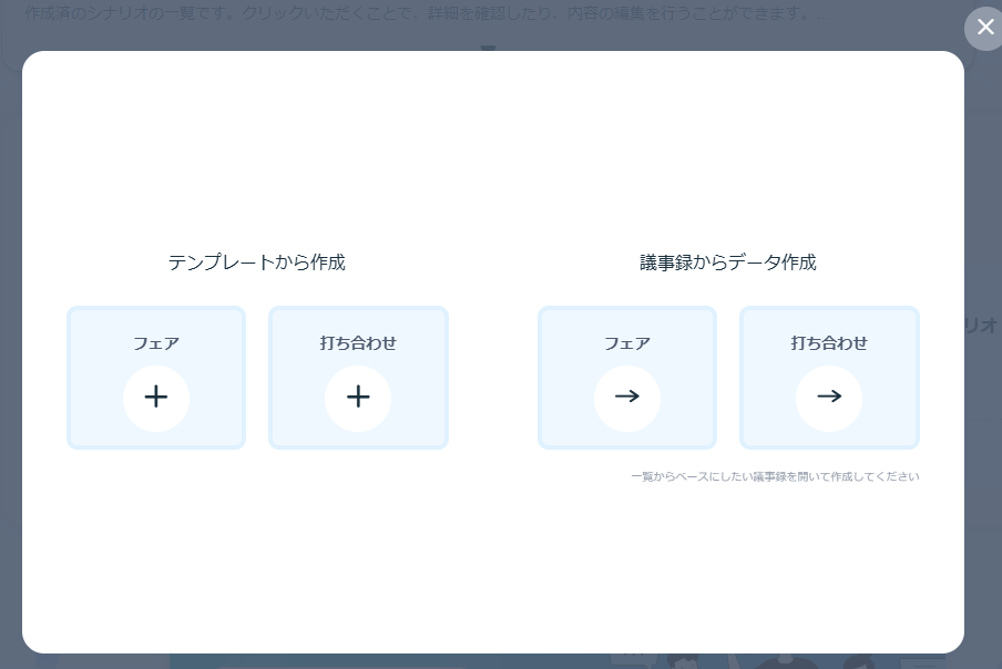 シナリオの新規作成方法は「議事録データから作成」「テンプレートから作成」「他のシナリオからコピー作成」3種類あります。