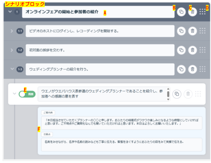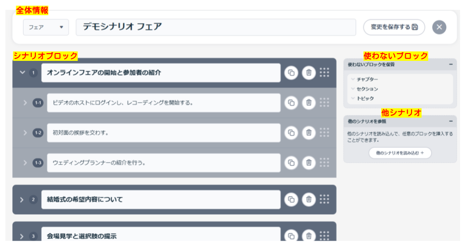 シナリオはチャプター/セクション/トピックの3種類のブロックによって構成され、トピックには「ご案内例」「注意点」の情報が付随します。