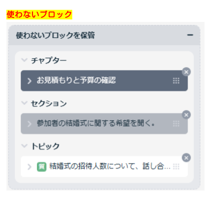 チャプター/セクション/トピックの各ブロックで使わないものを別途保管しておくことができます。